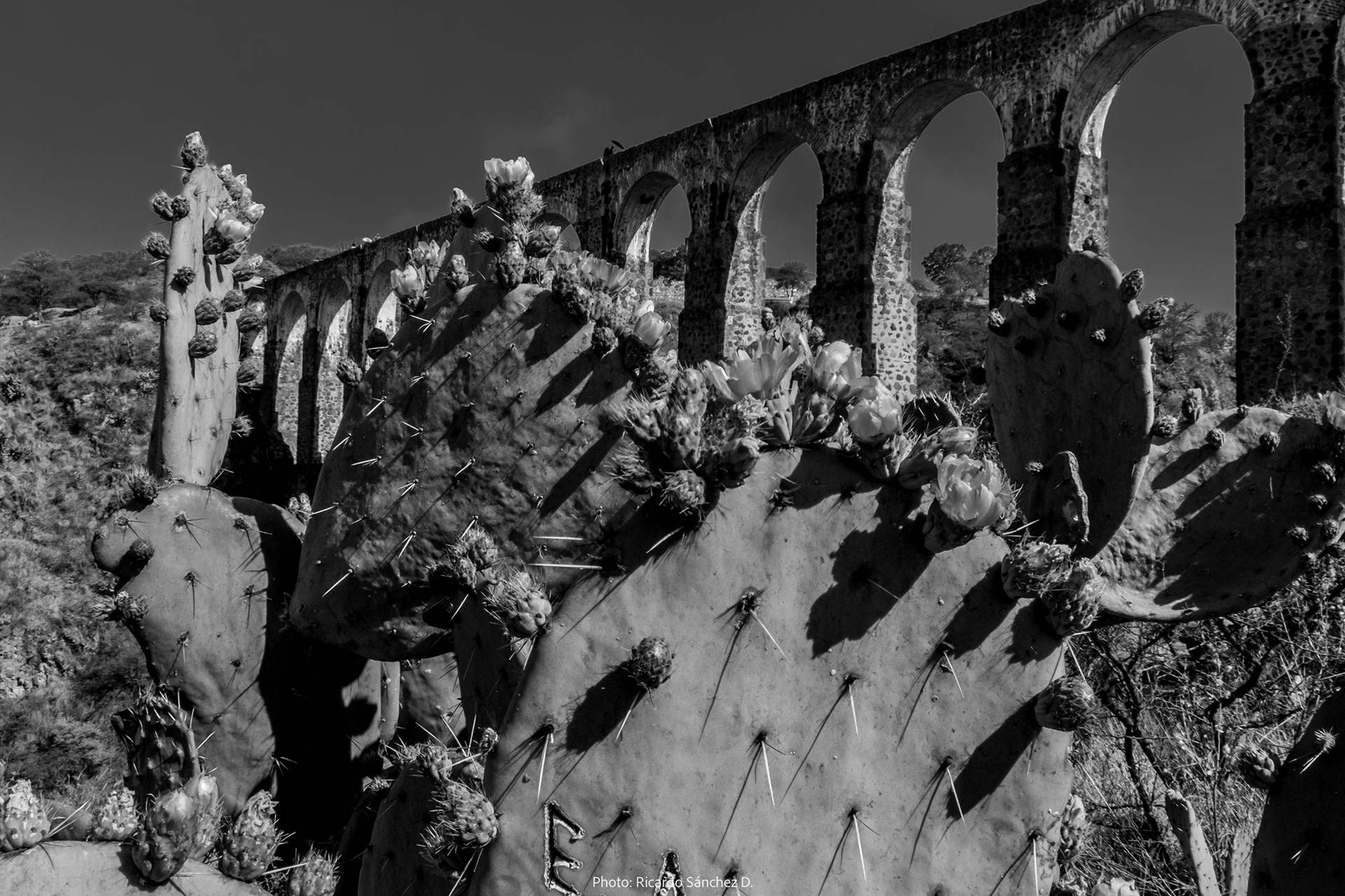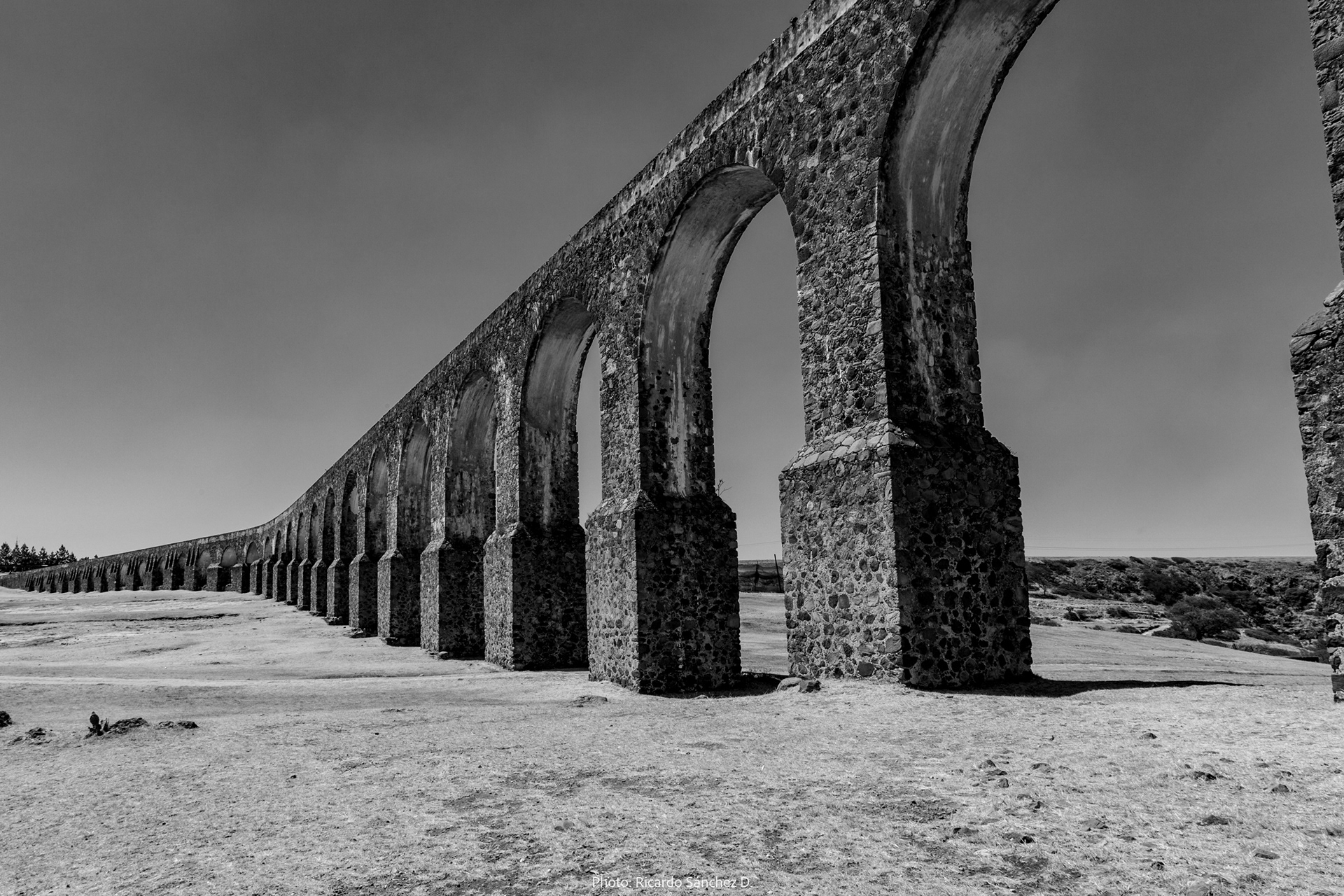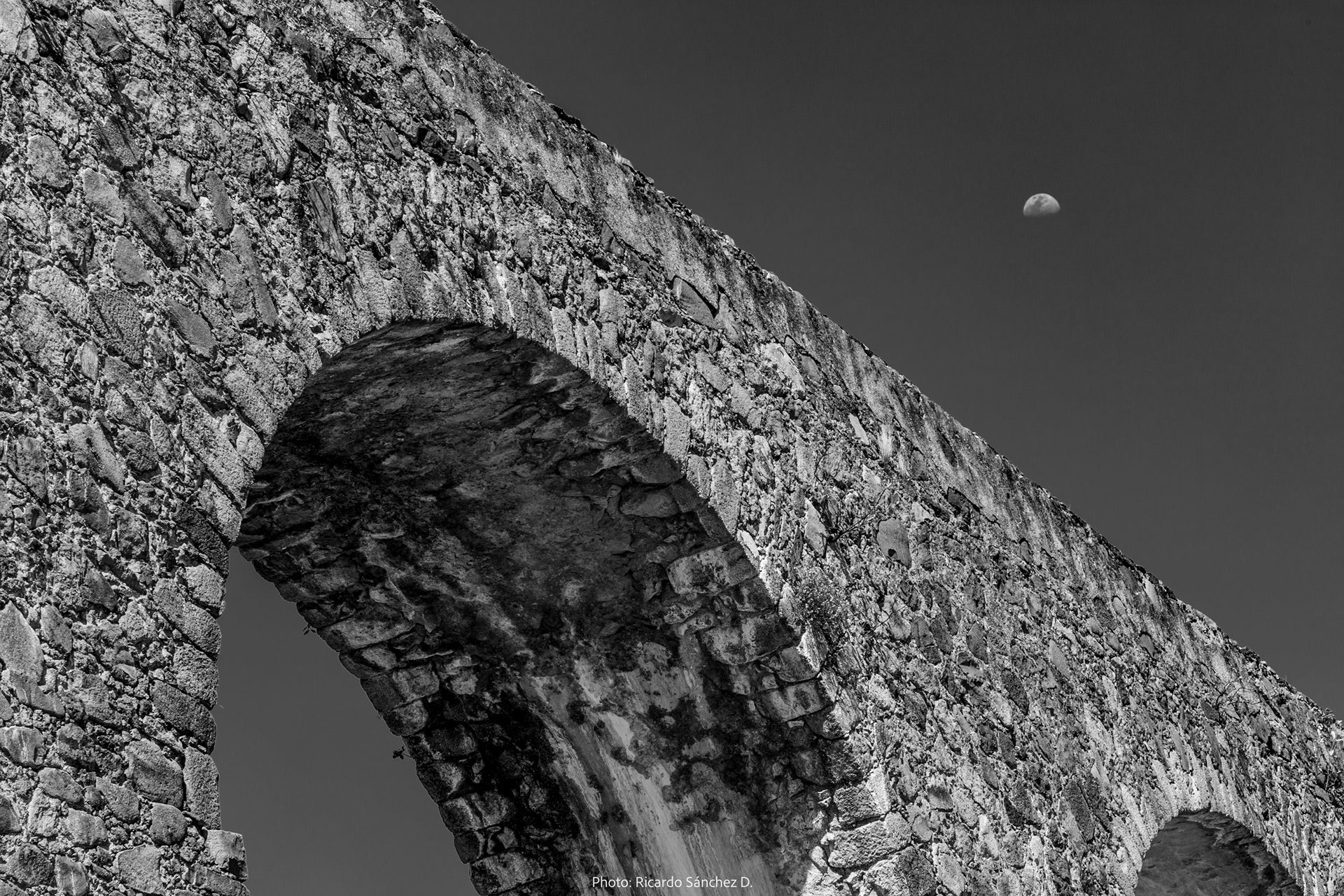 Estudio fotográfico en blanco y negro del sitio arqueológico Arcos del sitio en Tepozotlán, estado de México.